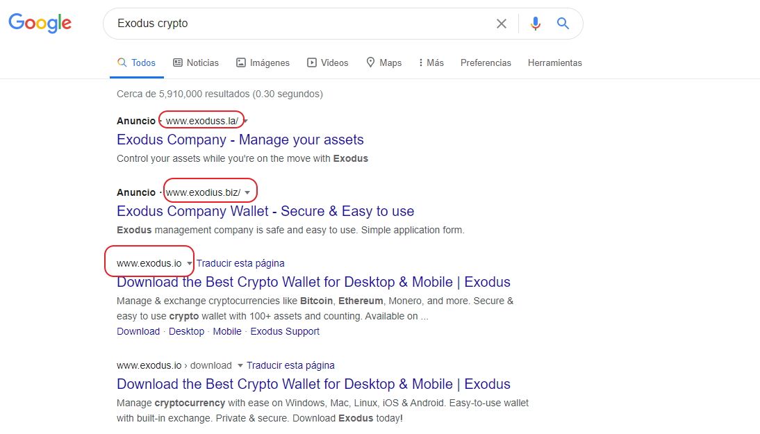 Una sencilla búsqueda de Google para “Exodus” arroja varios resultados de páginas falsas que están por encima incluso de la página real (exodus.io). Pese a ello, no es difícil adivinar cuál es la original y cuáles son las falsas si nos fijamos en la URL. El dominio de las réplicas cambia varios caracteres, con resultados como “exodius.biz”, “exdus.io” o “exoduss.la”.