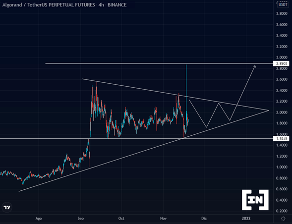 ALGO presenta una estructura alcista en forma de triángulo. Esta formación ascendente indica que los compradores son mas agresivos que los vendedores debido a las grandes noticias que últimamente giran en torno al metaverso.