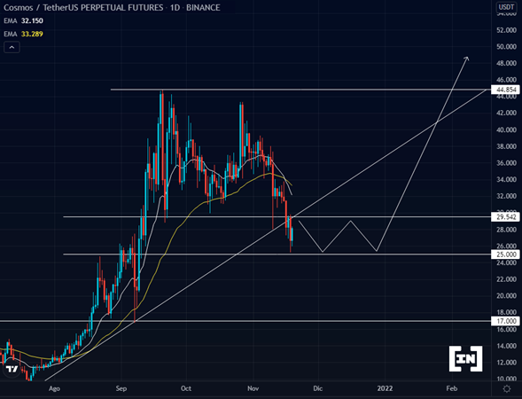 En ATOM la línea de tendencia alcista marcada por mínimos sucesivos ha sido perforada justo sobre el soporte dinámico de los 29.5 dólares.