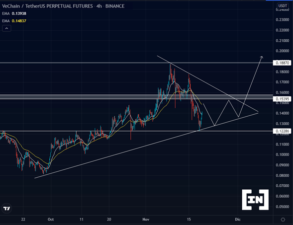 En las ultimas horas VeChain ha presentado un fuerte rechazo sobre el soporte dinámico de los 0.12 dólares, creando de esta manera un triángulo simétrico.