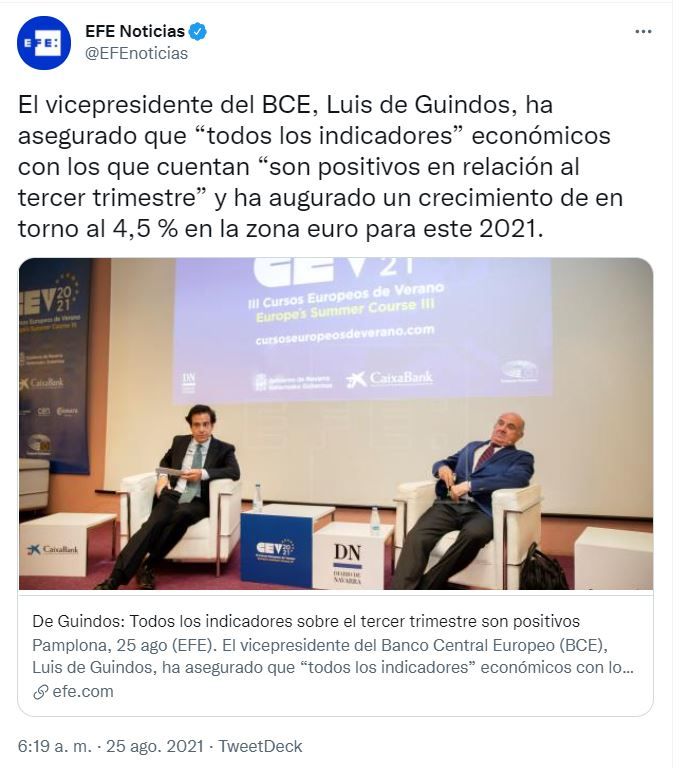 El vicepresidente del BCE señaló que los indicadores económicos son positivos para el tercer trimestre en Europa y pronosticó un crecimiento de 4.5% del Producto Interno Bruto (PIB). El foro fue patrocinado por el Parlamento Europeo y la Comisión Europea.