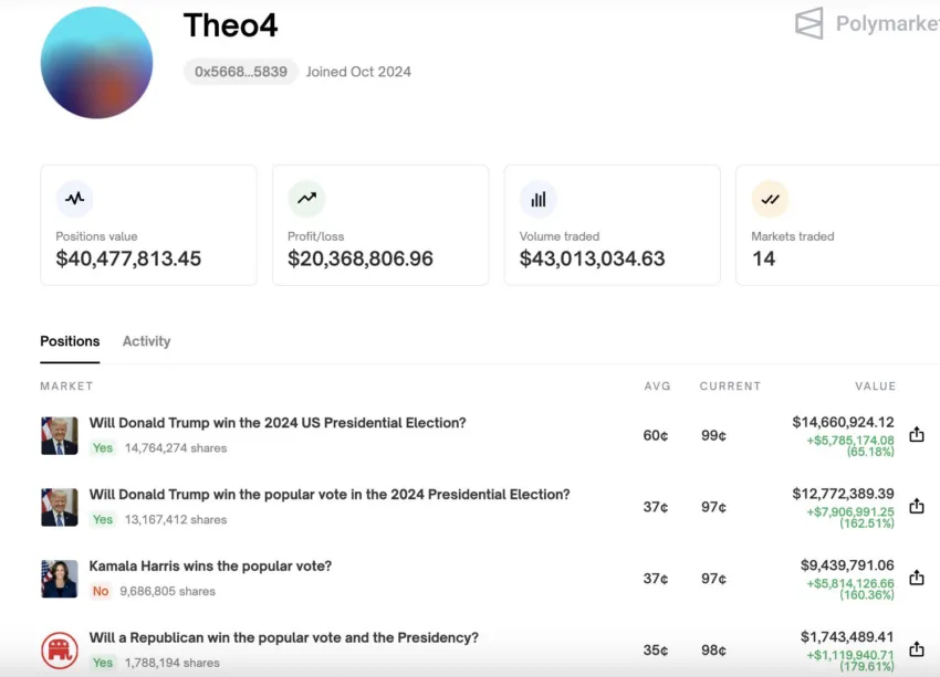 La cuenta más grande de apuestas a favor de Trump en Polymarket, conocida como “Theo4”, obtuvo más de 20,4 millones de dólares en ganancias con sus apuestas a favor de Trump, según datos compartidos por Lookonchain el 6 de noviembre.