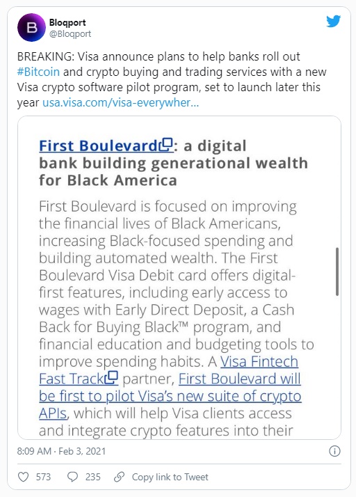 Visa dice que First Boulevard se convertirá en su primer socio en lanzar un nuevo programa piloto de interfaz de programación de aplicaciones cripto (API) a finales de este año. Según lo informado por el gigante de las tarjetas de crédito, esta cooperación permitirá a los clientes de Visa acceder e integrar funciones de cripto en sus productos.