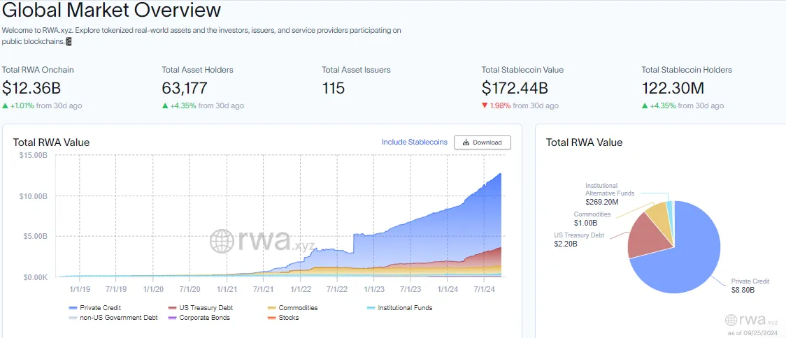 A medida que Visa se adentra en el creciente espacio de los activos tokenizados, podría solidificar su cuota de mercado, dado el tamaño del sector. Datos según rwa.xyz muestran que el valor de los activos tokenizados ha alcanzado los 12,36 mil millones de dólares, con más de 63,000 tenedores de activos.