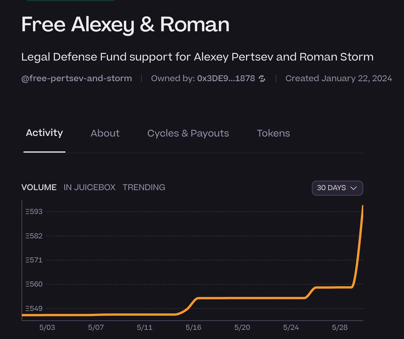 Los datos de Etherscan revelan que Buterin donó al fondo de defensa “Free Pertsev and Storm” en la plataforma de recaudación de fondos descentralizada Juicebox el 30 de mayo. En el momento de escribir este artículo, el fondo ha acumulado 591 ETH, equivalentes a 2,2 millones de dólares, para apoyar las batallas legales de los desarrolladores.