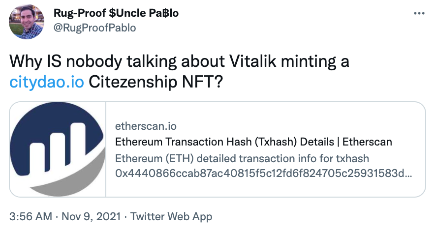 Ayer, 9 de noviembre, un usuario de Twitter se preguntaba cómo podía haber pasado desapercibido un evento que probaba como Vitalik Buterin, co-fundador de Ethereum, ha creado su ciudadanía NFT del proyecto de CityDAO.