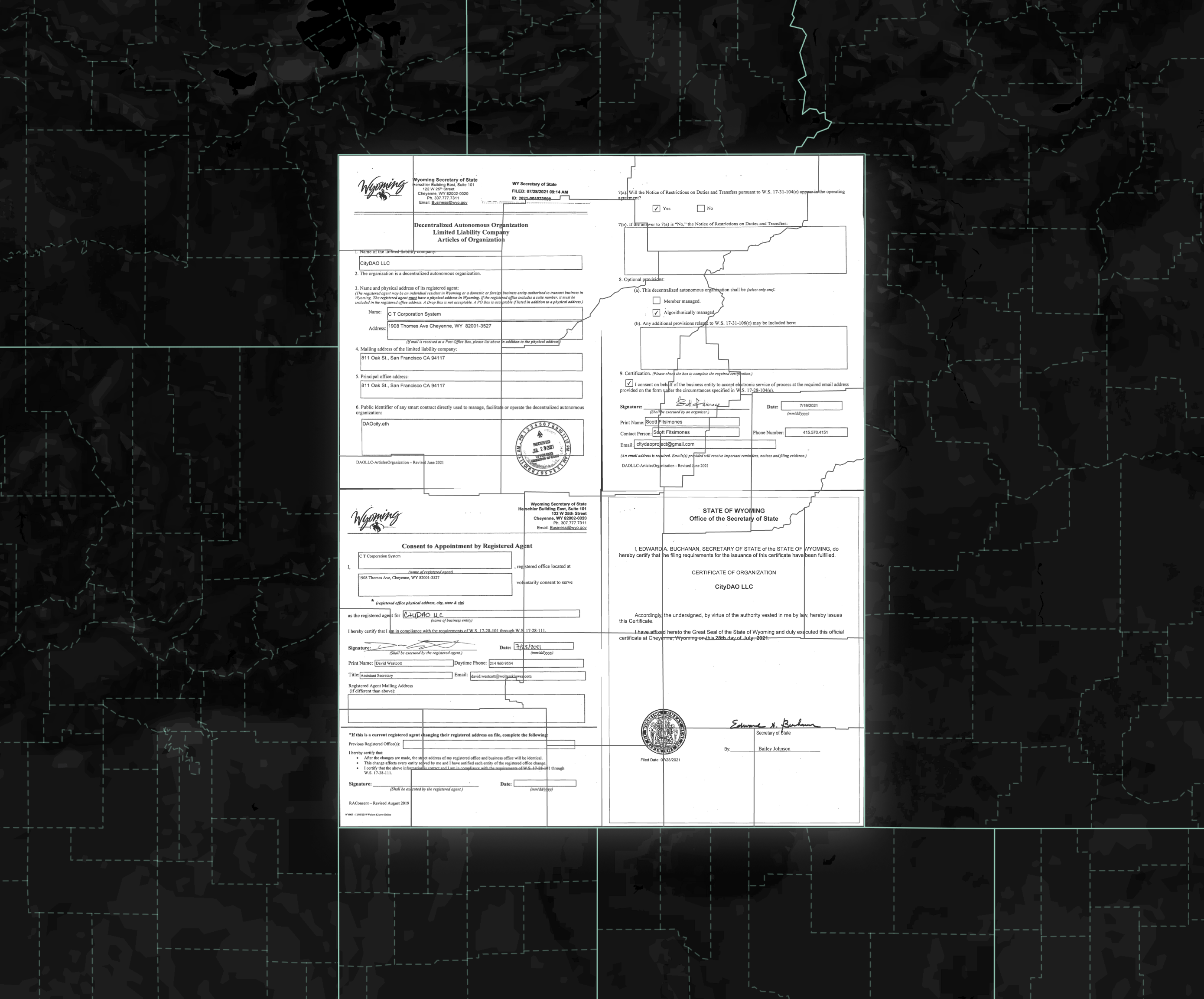 El proyecto presenta la documentación administrativa con la que Wyoming registra el DAO oficialmente cómo CityDAO LLC, convirtiéndolo en un ente jurídico bajo la administración de Wyoming.