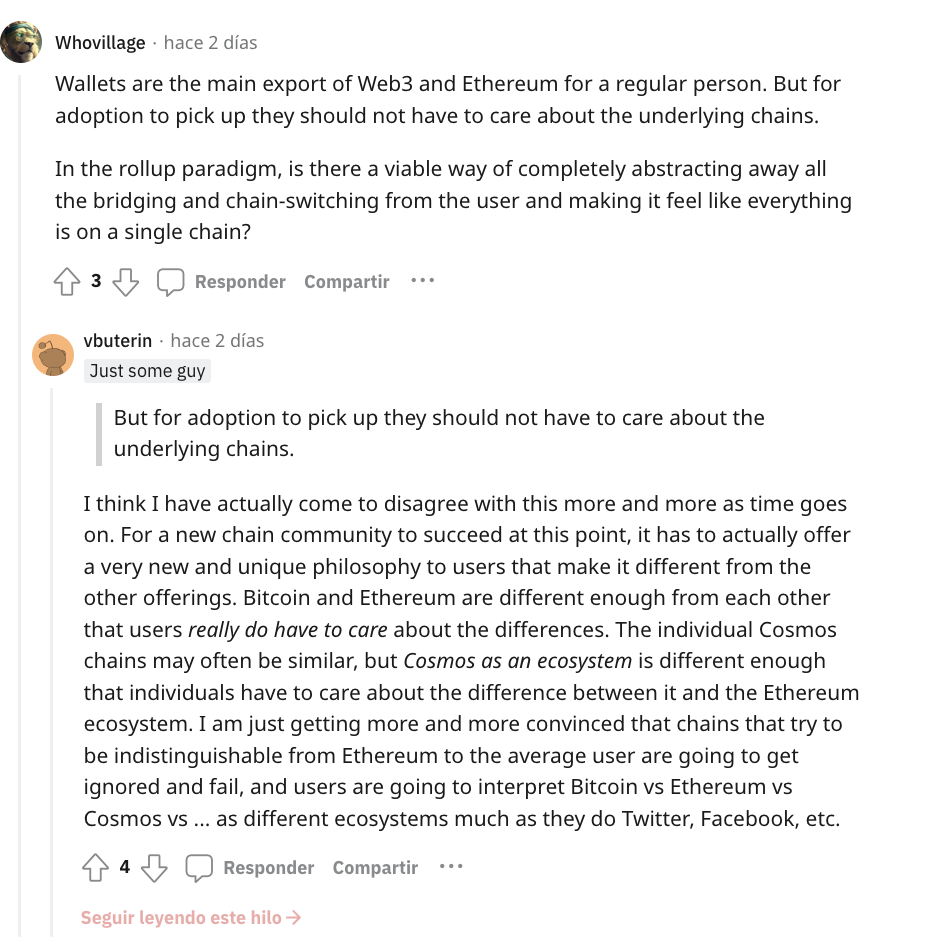“Me estoy convenciendo cada vez más de que las cadenas que intentan ser indistinguibles de Ethereum para el usuario promedio serán ignoradas y fallarán, y los usuarios interpretarán Bitcoin vs Ethereum vs Cosmos vs … como ecosistemas diferentes tanto como ellos”.