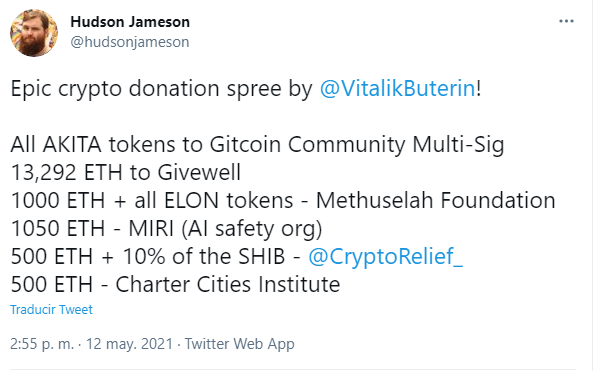 De acuerdo a lo reportado por el influencer de criptomonedas en Twitter @hudsonjameson, Buterin realizó importantes donaciones benéficas en SHIB y AKITA, otra criptomoneda mene que ha recibido un gran impulso en los últimos días.