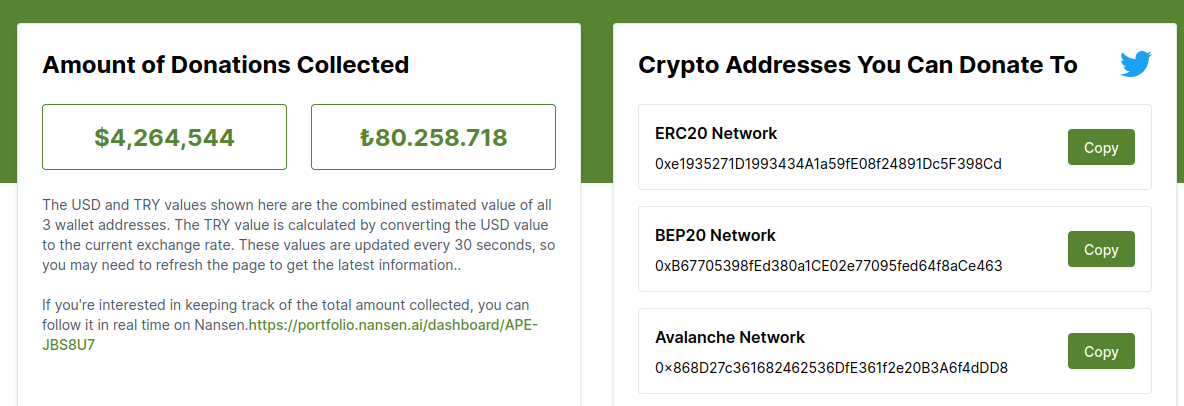 Al momento de la publicación, la página web oficial de Ahbap señala que se han recaudado 4,26 millones de dólares a través de donaciones con criptomonedas.