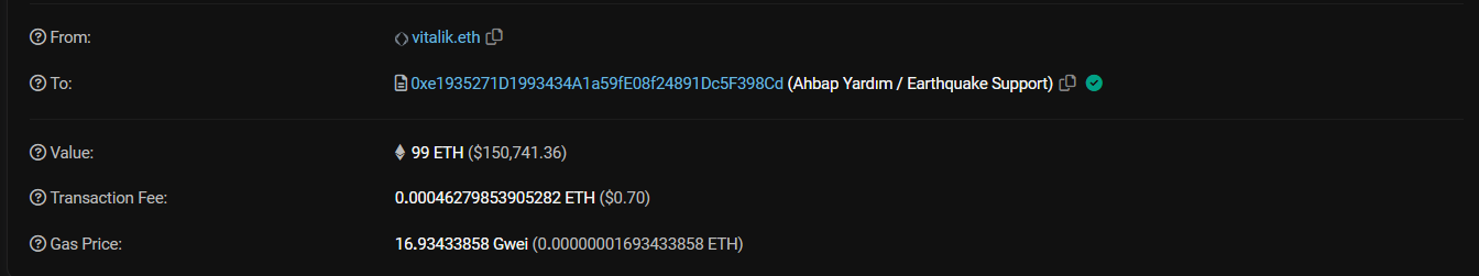 Vitalik Buterin, el famoso cofundador de Ethereum, ha realizado una donación de aproximadamente 150,000 dólares en ETH para las víctimas del terremoto que azotó a Turquía y Siria.