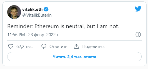 Muchos miembros de la comunidad cripto se apresuraron a comentar sobre las acciones del gobierno ruso. Vitalik Buterin, uno de los desarrolladores de la segunda criptomoneda más grande, Ethereum, se pronunció. Comparto su opinión en un hilo de Twitter, aclarando que Ethereum está fuera de la política: