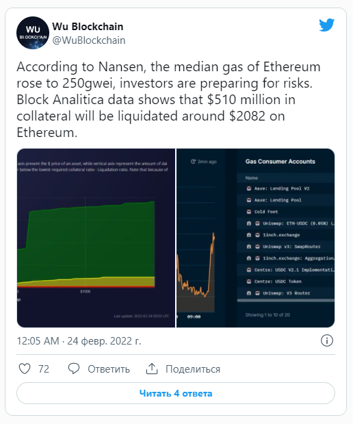 Esto lo indica el aumento de la comisión, en el contexto de un aumento en la carga de transacciones en la red de criptomonedas, así como la aparición de una gran cantidad de solicitudes para la liquidación de posiciones en ETH.