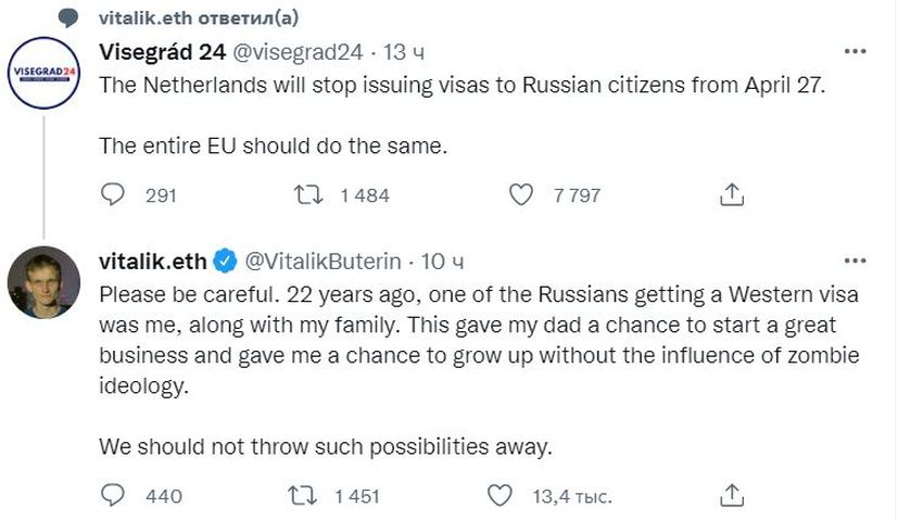 El cofundador de Ethereum, Vitalik Buterin, se opuso a la imposición generalizada de sanciones contra los ciudadanos rusos. El desarrollador compartió su opinión en Twitter.