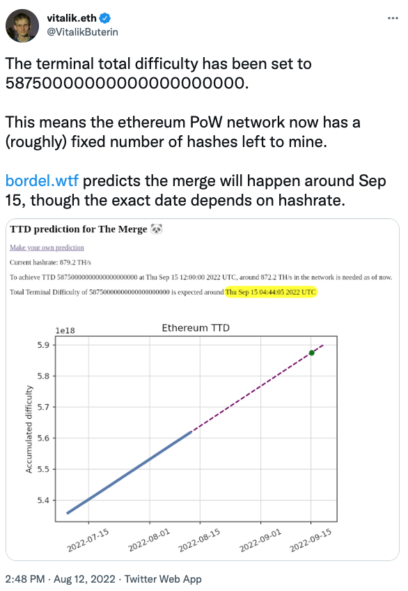 Según datos presentados por Vitalik Buterin, basados en el total de la dificultad del terminal y el número de hashes que aún quedan por minar, predice que el 15 de septiembre podría ser la fecha en la que la actualización denominada Merge (Fusión) se lance en Ethereum.