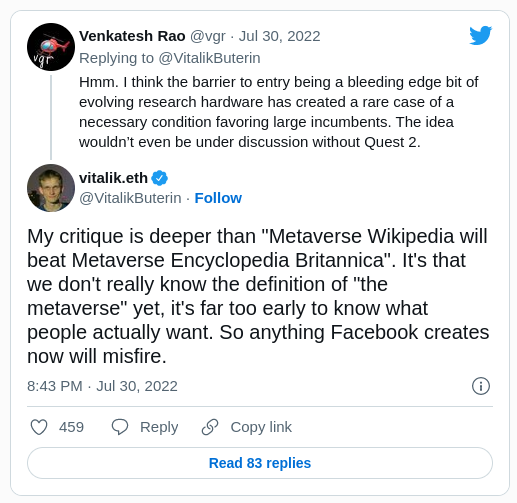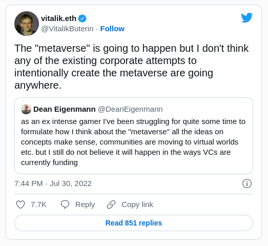 En respuesta, Vitalik tuiteó: “El ‘metaverso’ va a suceder, pero no creo que ninguno de los intentos corporativos existentes de crear intencionalmente el metaverso vaya a ninguna parte”.