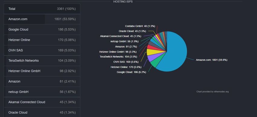 Al momento de escribir este artículo, más de 3,3 mil nodos de Ethereum (el 57.2% del número total de nodos de la red) funcionan a través de servicios de alojamiento centralizados.