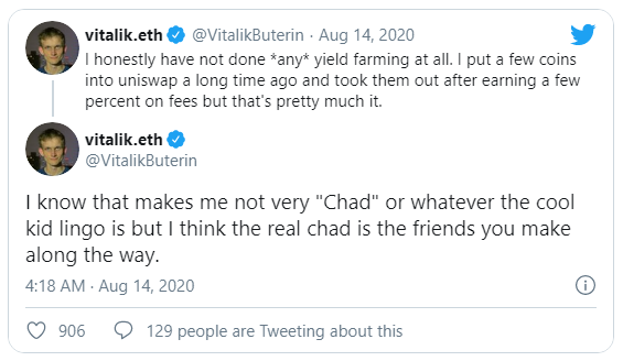 Estos cantos de sirena de las DeFi pueden despertar la codicia de muchos y aportar a la misma popularidad de Ethereum, pero Vitalik Buterin no parece estar muy entusiasmado con la idea. En un tuit reciente compartió que no era muy fanático del yield farming y “solo invirtió pequeñas cantidades en Uniswap hace mucho tiempo y las sacó luego de ganar un pequeño porcentaje en comisiones”