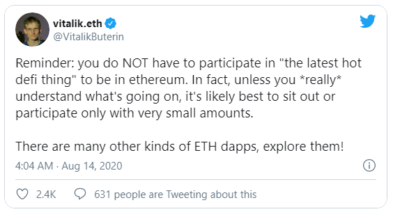 El tuit de Vitalik parece más orientado a preservar los intereses de los inversores que al de cuidar la integridad de su propia blockchain. Las DeFi han tenido un crecimiento tan fuerte que muchos temen que sean la burbuja del 2020 en caso de que su capitalización supere su valor fundamental.