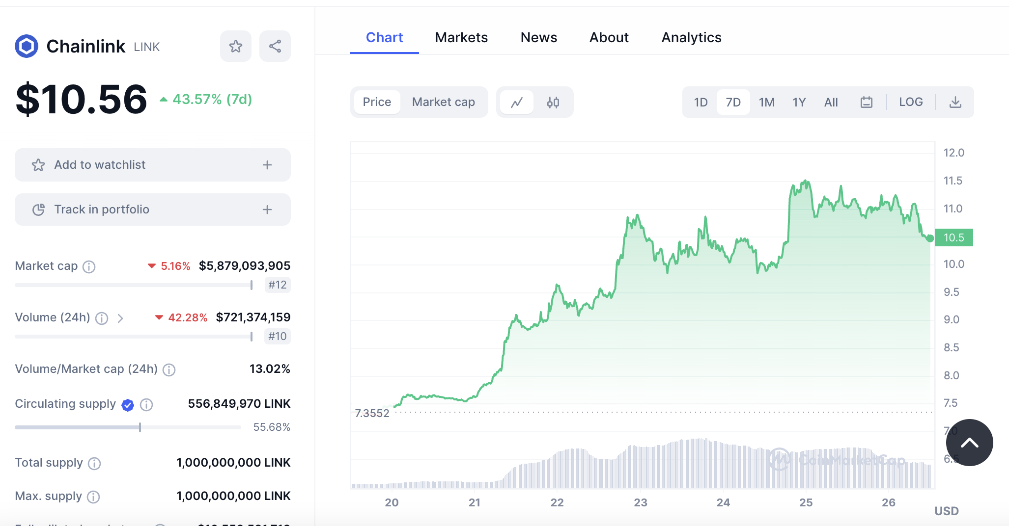 SponsoredEn la última semana, el precio del token de Chainlink, LINK, ha pasado de 7,35 a 10,5 dólares. Su mayor pico lo alcanzó el 25 de octubre, al llegar a los 11,51 dólares. De igual forma, la capitalización de mercado pasó de 4,09 billones a 5,86 billones de dólares, aunque llegó a 6,41 billones de dólares, con un aumento de 43,07%, de acuerdo con CoinMarketCap.