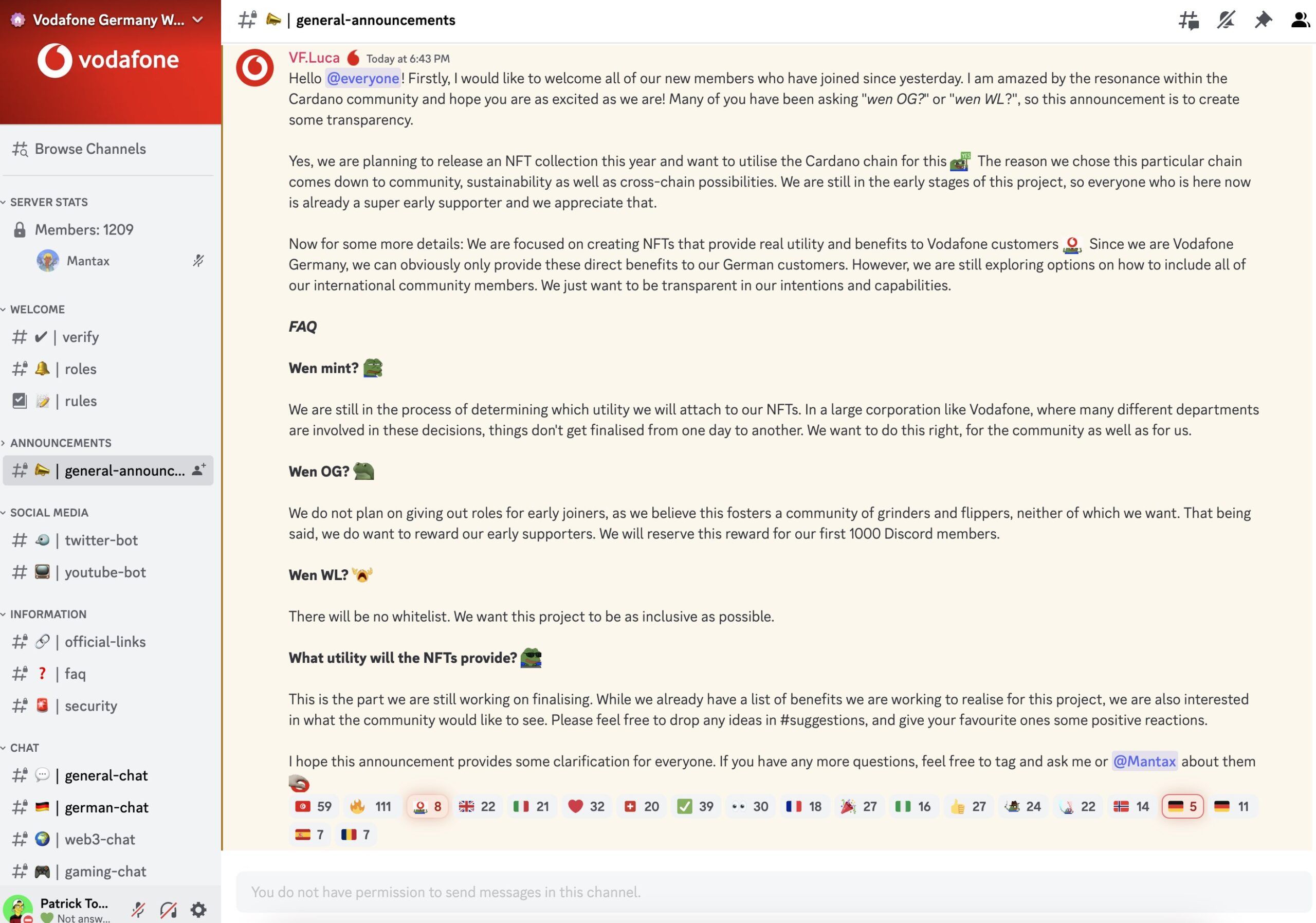 El desarrollador de NMKR, Patrick Tobler, es quien ha publicado acerca de la mencionada posibilidad. El profesional subió a redes sociales una captura de pantalla del chat de Slack de Vodafone Deutschland. En ese espacio de comunicación interna, el gigante de las telecomunicaciones describe su propuesta para el lanzamiento de una colección NFT.
