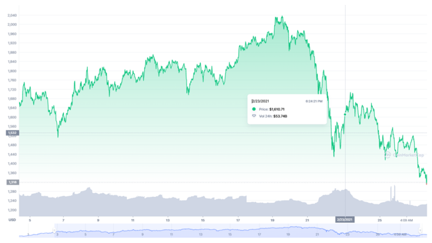 Febrero de 2021 fue un momento emocionante para el espacio cripto. Ethereum superó el hito del precio de 2,000 dólares por primera vez y finalmente se estableció en un máximo intradiario de 2,036.29 dólares el 20 de febrero.