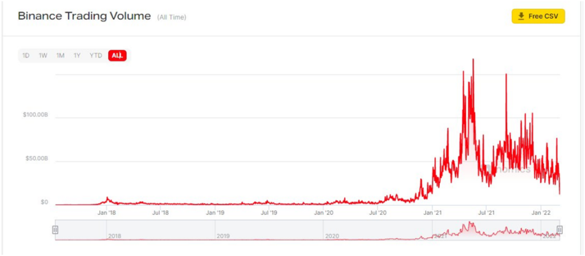 Binance registró un volumen mensual máximo histórico de 3,11 billones de dólares en mayo de 2021 y cerró el último mes del año registrando un volumen total de trading de 1,44 billones de dólares.