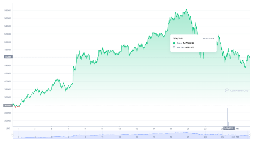 Bitcoin también superó los 50,000 dólares por primera vez el 16 de febrero y finalmente alcanzó un máximo de 58,330.57 dólares el 21 de febrero.
