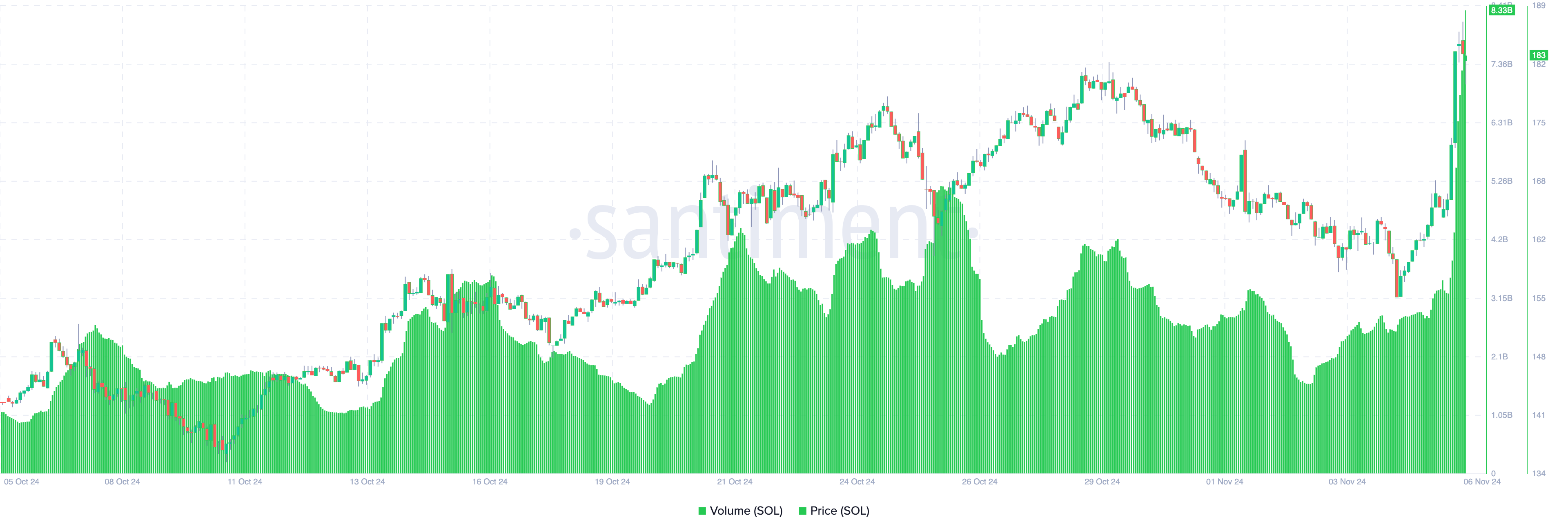 Según datos de Santiment, el 5 de noviembre, antes de que comenzaran las elecciones, el volumen on-chain de Solana era menor a 3 mil millones de dólares. Sin embargo, al momento de escribir esto, la métrica ha aumentado más del 150%, indicando un notable incremento en el interés por la criptomoneda.