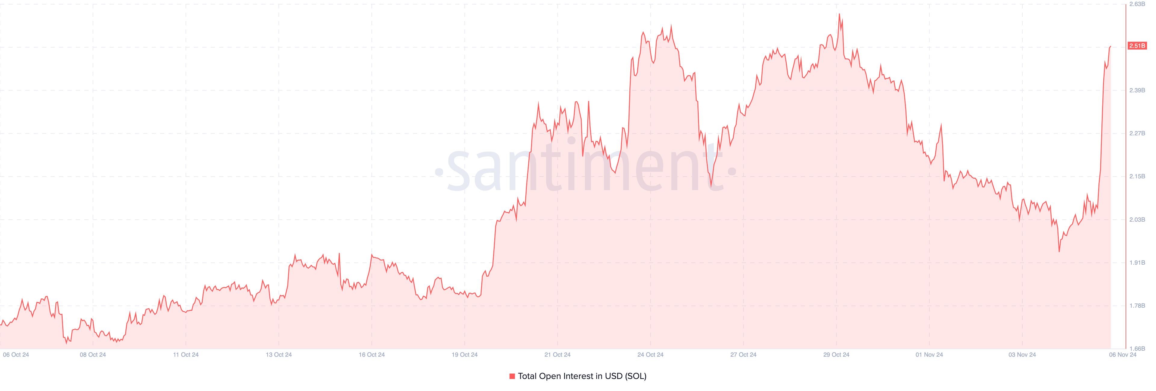 Además del volumen de trading, el Interés Abierto (OI) de Solana también ha visto un aumento significativo. Actualmente, el OI está en 2.51 mil millones de dólares, marcando su nivel más alto desde el 30 de octubre.