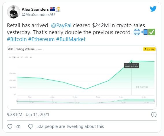 El gigante de los pagos internacionales, PayPal, registró un nuevo récord en trading diario de criptomonedas, ya que los volúmenes aumentaron a 242,5 millones de dólares el 11 de enero.