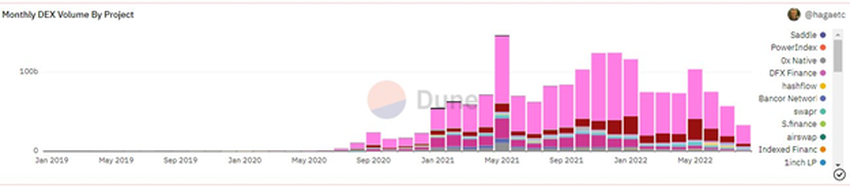 Además de Curve, otros DEX que se sabe que registran grandes volúmenes, como Uniswap, Synthetix, Balancer, DODO, Shibaswap y SushiSwap, también cayeron a nuevos mínimos.