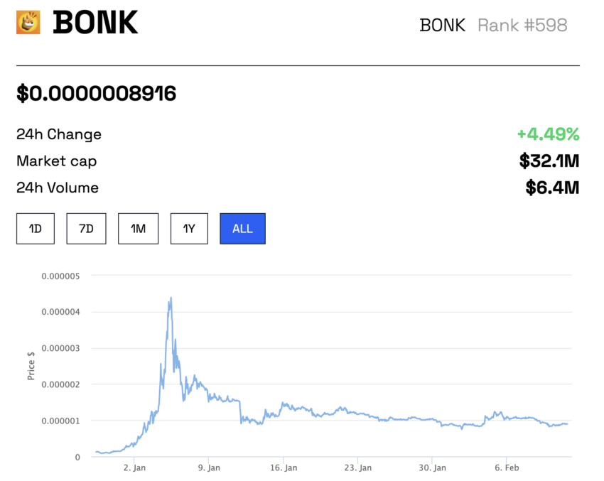 Una corrección gradual en el precio del token nativo de Solana siguió a la caída del valor de mercado de BONK. El precio de SOL cayó en picada 27%, pasando de un máximo de 26,87 dólares el 2 de febrero a un mínimo de 16,66 dólares ocho días después.