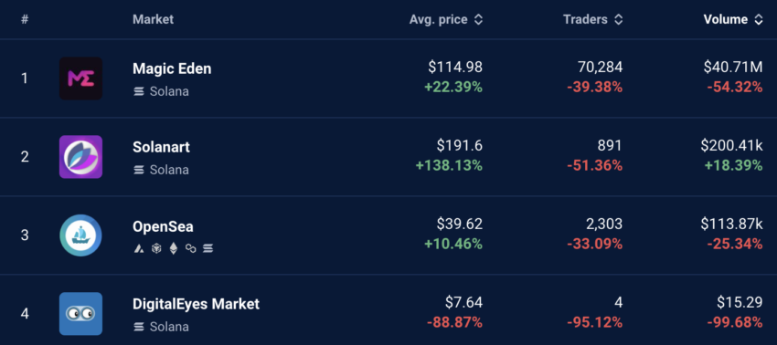 El volumen de trading en Magic Eden se redujo en 54,32% a 40,71 millones de dólares durante el último mes. Mientras tanto, el volumen de trading de transacciones NFT basadas en Solana en OpenSea cayó 25,34% a 113,870 dólares.