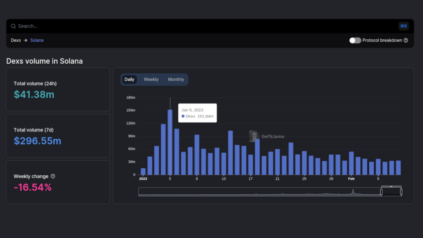 Los datos on-chain de DeFiLlama muestran que el volumen de trading en DEX basados en Solana se redujo a 41,58 millones de dólares el 10 de febrero, una caída del 27% en comparación con el mes anterior.
