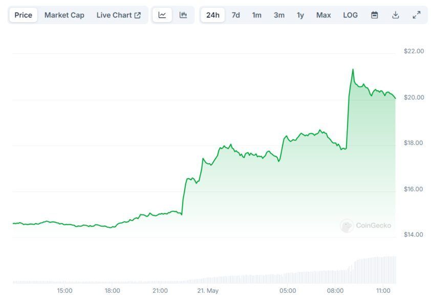 El token ENS respondió a las palabras del cofundador de Ethereum con un crecimiento instantáneo. Según CoinGecko, en el momento de escribir este artículo, el activo se cotiza a 20.05 dólares, habiendo aumentado su precio un 37% en las últimas 24 horas.