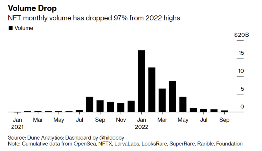 Los datos de Dune Analytics presentaron que el trading de NFT ha experimentado una gran recesión. Desde el pico de 17 mil millones de dólares en enero, el volumen de trading de NFT ha caído hasta los casi 470 millones de dólares en septiembre, una caída del 97% en nueve meses.