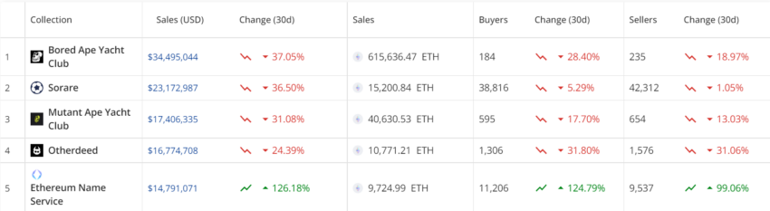 Las clasificaciones de colecciones de NFT de los últimos 30 días por volumen de ventas destacaron que, si bien las principales colecciones de NFT como BAYC, Sorare, Mutant Ape Yacht Club, Otherdeed y CryptoPunks experimentaron una pérdida en el precio mínimo, así como en compradores y vendedores, Ethereum Name Service (ENS ), sin embargo, estaba en números verdes.