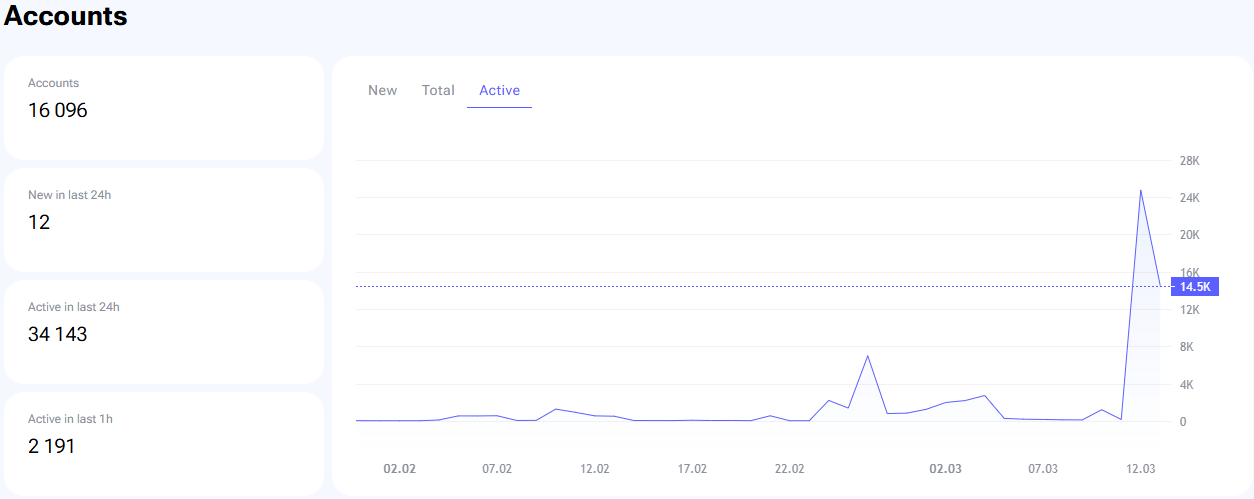 Sin embargo, al 13 de marzo, la solución de escalabilidad L2 está procesando solo 0.84 TPS, manejando solo 52,516 transacciones en las últimas 24 horas. Esto es una fuerte caída desde su pico del día de lanzamiento de casi 150 millones de transacciones.