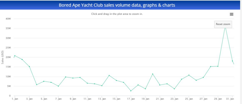 El volumen de ventas máximo de un solo día en 2022 se generó el 30 de enero, cuando BAYC vio liquidez en el valor de aproximadamente 36 millones de dólares en sus NFT.