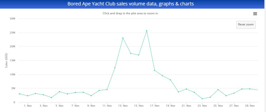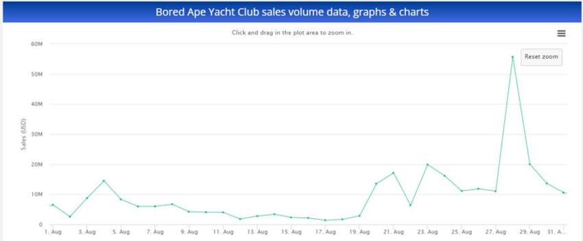 Bored Ape Yacht Club registró un máximo histórico en volumen de ventas de un solo día en agosto de 2021. En ese momento alcanzó aproximadamente 55 millones de dólares.