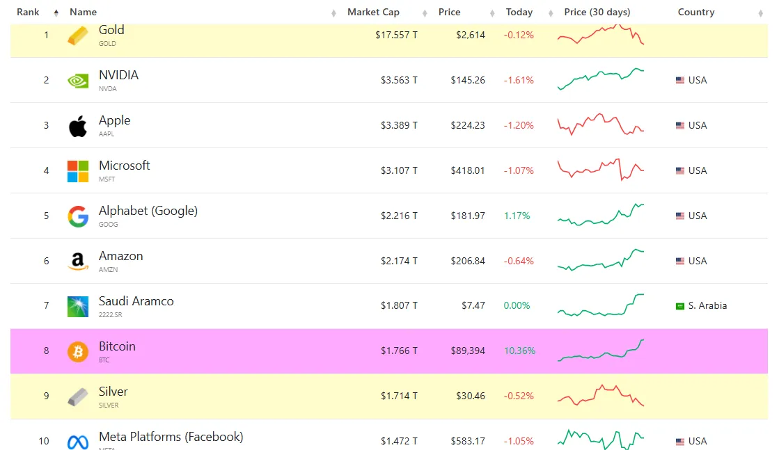 Superó a la plata en capitalización de mercado y convirtió a Bitcoin en el octavo activo global más grande con 1,736 billones de dólares. El impulso detrás de IBIT y otros ETF spot de Bitcoin destaca el creciente apetito institucional por la exposición a Bitcoin.