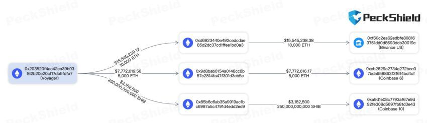 Según la firma, el prestamista envió 250 mil millones de unidades de tokens Shiba Inu junto con 15,000 tokens ETH a los exchanges. Agregó que Voyager había recibido 105,000 unidades de ETH del exchange en bancarrota FTX en septiembre de 2022.