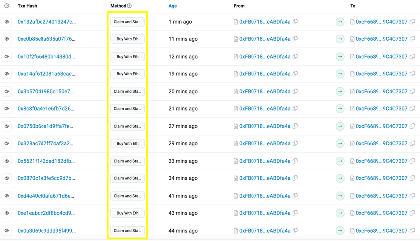 No es extraño pues ver imágenes como la siguiente, correspondiente al cuadro de operaciones de WSM en Etherscan, donde la mayoría de operaciones recientes ya son precisamente depósitos en staking.