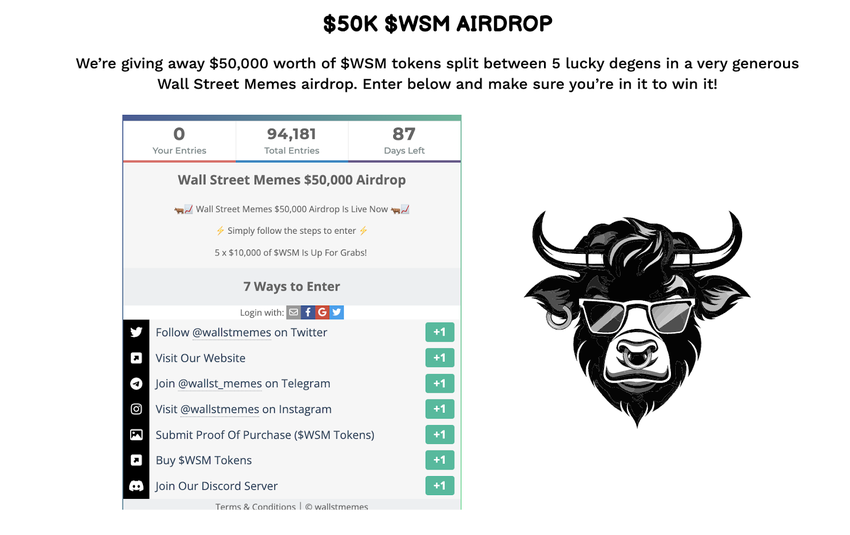 Para participar en el airdrop bastará con cumplir una serie de requisitos sencillos, que pueden ir desde el justificante de adquisición de tokens hasta seguir a Wall Street Memes en Twitter. Cuantos más requisitos cumplamos, mayores serán nuestras opciones de resultar premiados en el sorteo.