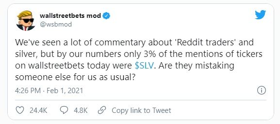 Otros usuarios también señalaron que las llamadas a un squeeze plateado se concentraron en usuarios con nuevas cuentas. Este descubrimiento dio cierta credibilidad a afirmaciones anteriores de que el subreddit había sido infiltrado por agentes provocadores. Durante la semana pasada, los miembros de WSB también señalan que el squeeze de la plata podría ser un “ataque coordinado” de las empresas de Wall Street.