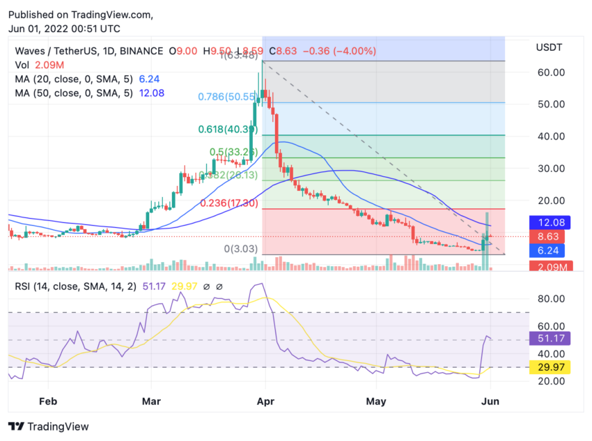Waves (WAVES) se encuentra entre los pocos proyectos que lograron un buen desempeño a principios de 2022. Entre febrero y marzo, el precio de WAVES ganó un 717%, de 8,54 dólares a 61,30 dólares. Su repunte alcista fue impulsado notablemente por el lanzamiento de su mainnet y su listado en Binance.