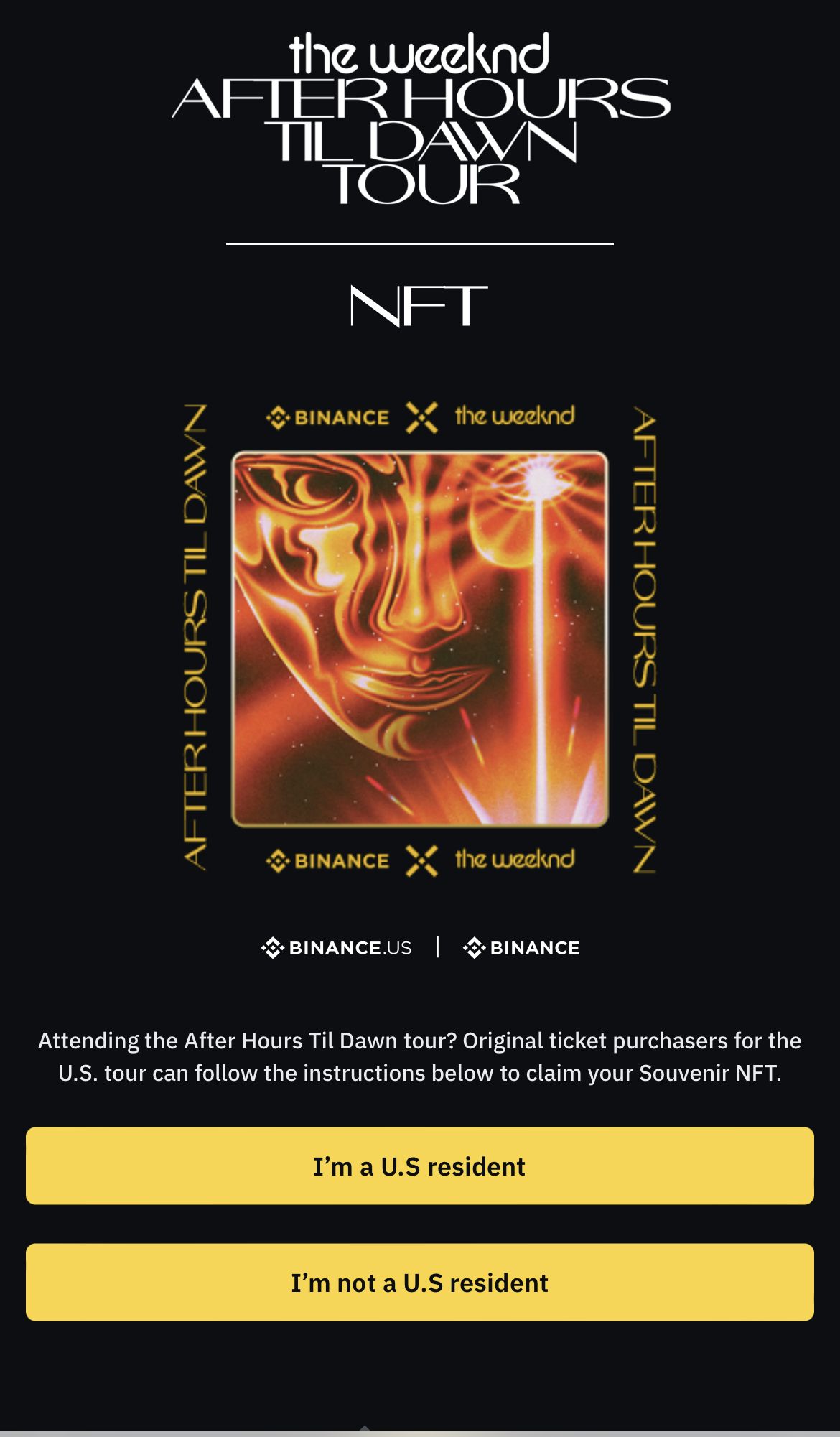 Los compradores de boletos originales del Weeknd After Hours Til Dawn Tour pueden reclamar un NFT de recuerdo de Binance.US (para residentes de Estados Unidos) o Binance.com (para no residentes de Estados Unidos). Cada ID de usuario (UID) puede reclamar un máximo de un NFT de recuerdo.