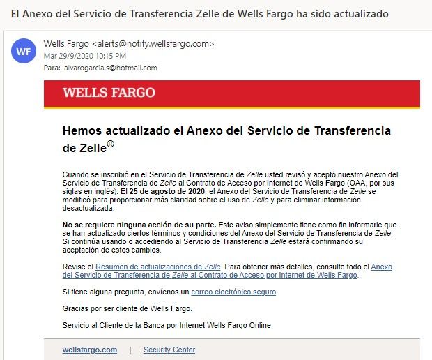 La información se dio a conocer a través de una serie de correos electrónicos enviados por Wells Fargo a sus usuarios el pasado 29 de septiembre mediante la cual notificaron que habían actualizado el Anexo del Servicio de Transferencia de Zelle.