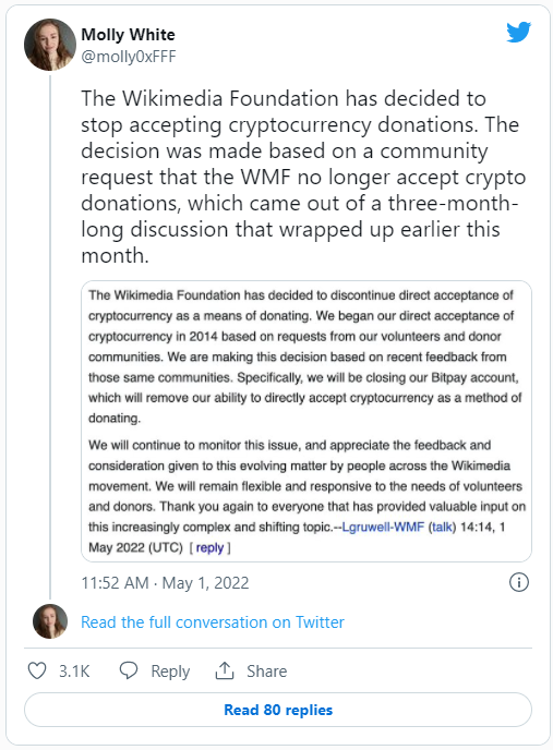 La Fundación Wikimedia (WMF) ha anunciado que dejará de aceptar donaciones con criptomonedas citando preocupaciones ambientales.